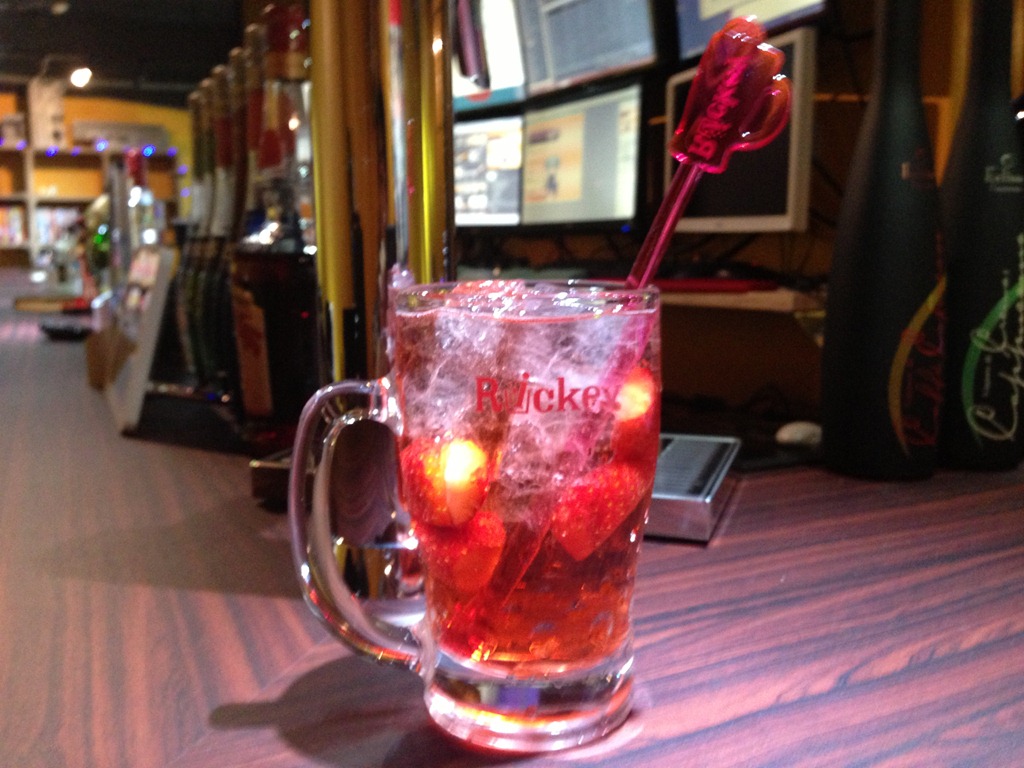 材料は、リキュールの中でもかなり甘い方のストロベリーリキュールを使うせいもありますが、それをソーダで割るんですが、フルーツ‥リッキーというだけに、生のイチゴがいくつか入っています。これは、パイナップルになったり、オレンジになったりっていろいろ使うリキュールとの組み合わせが楽しめるものなんです。
